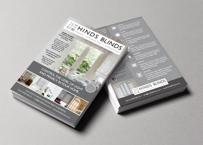 The HInds Blinds A5 leaflets have been a great way for Craig and the team to spread the word and help their potential customers to understand the benefits of adding blinds to their windows.